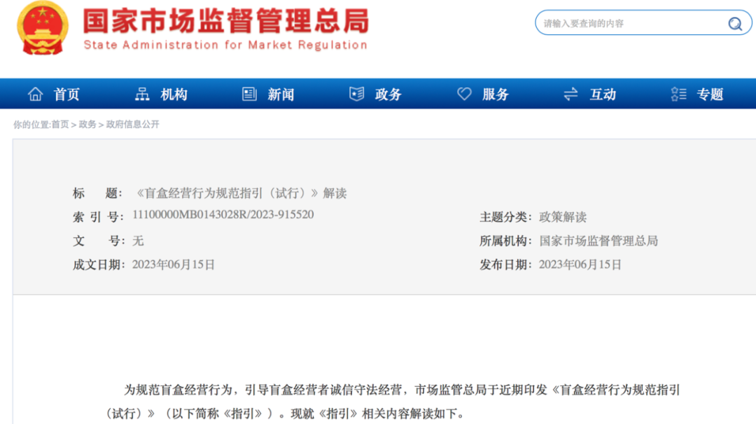 日前(6月15日),国家市场监督管理总局(以下简称“市监总局”)发布了一则《盲盒经营行为规范指引《试行》解读》(以下简称《规范》),明确规定:食品、化妆品,不具备保障质量安全和消费者权益条件的,不应当以盲盒形式销售。